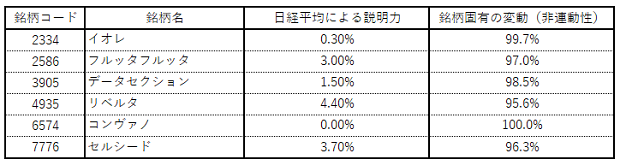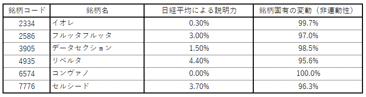 上記の通り、弊社が紹介した中小型グロース銘柄は概ね日経平均で変動を説明できる割合が非常に小さく、変動の大半(95%以上)が銘柄固有の要因(個別のファンダメンタルズ、材料、需給など)で動いていることが統計的に示唆されます。