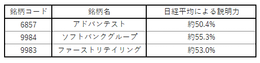 これらの銘柄は統計上、日経平均の値動きに対して高い説明力を示しており、日経平均株価自体が、構成ウェイトが高い少数の大型株の値動きに大きく影響されると解釈するのが合理的です。