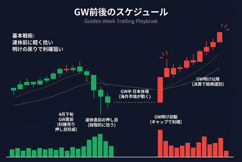 基本戦術:連休前に軽く拾い、明けの戻りで利確狙い。