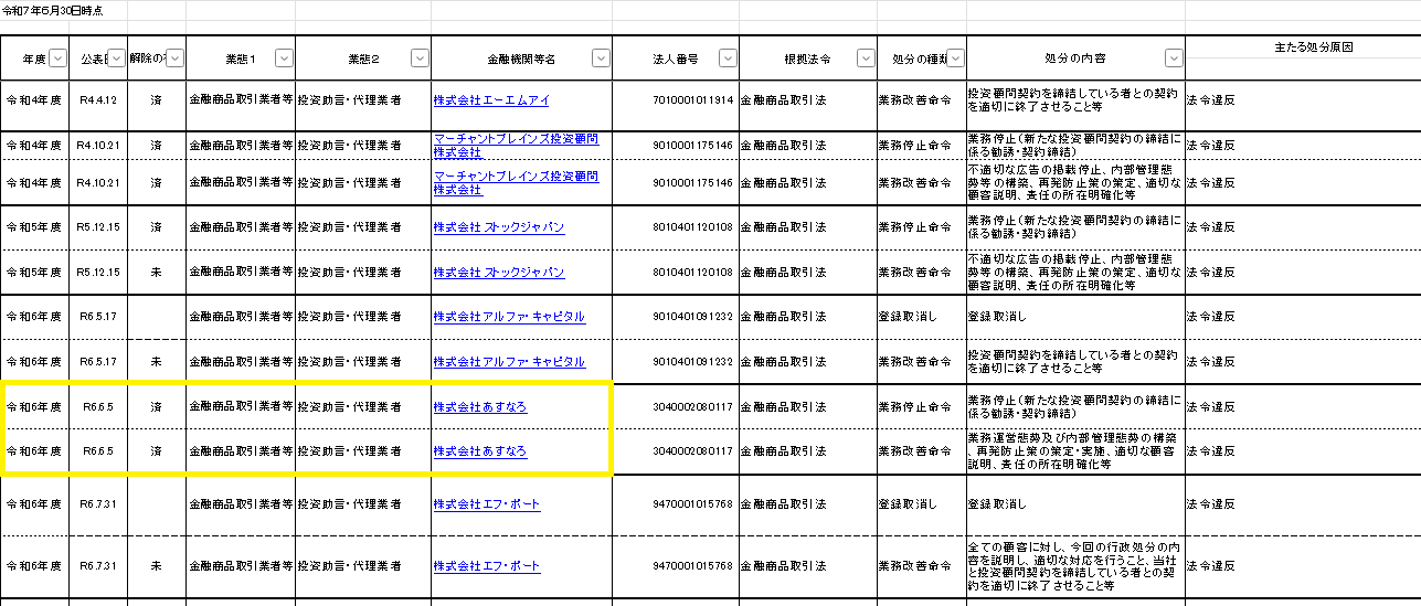 金融庁公表の行政処分事例にてあすなろは「 済 」と確認